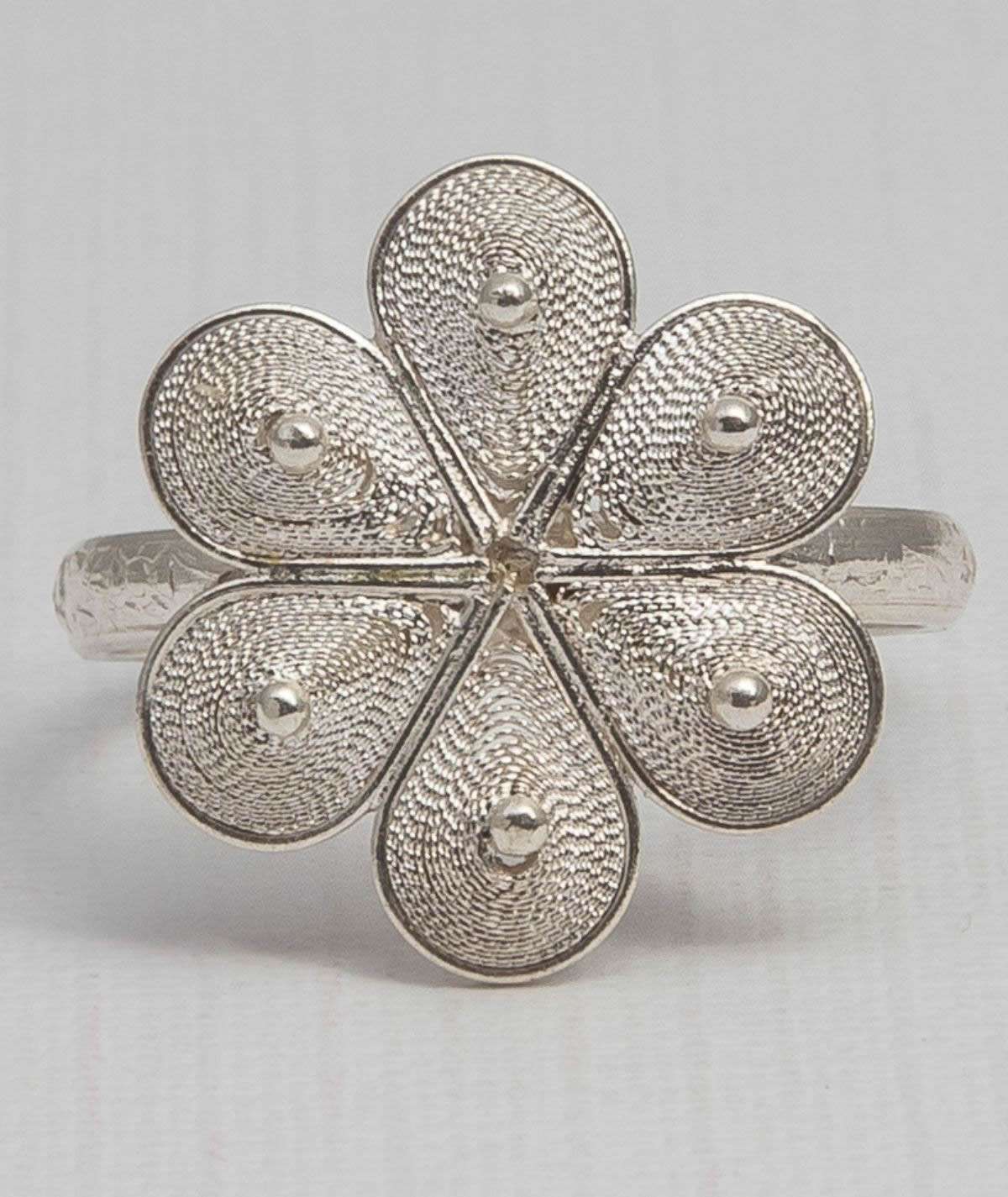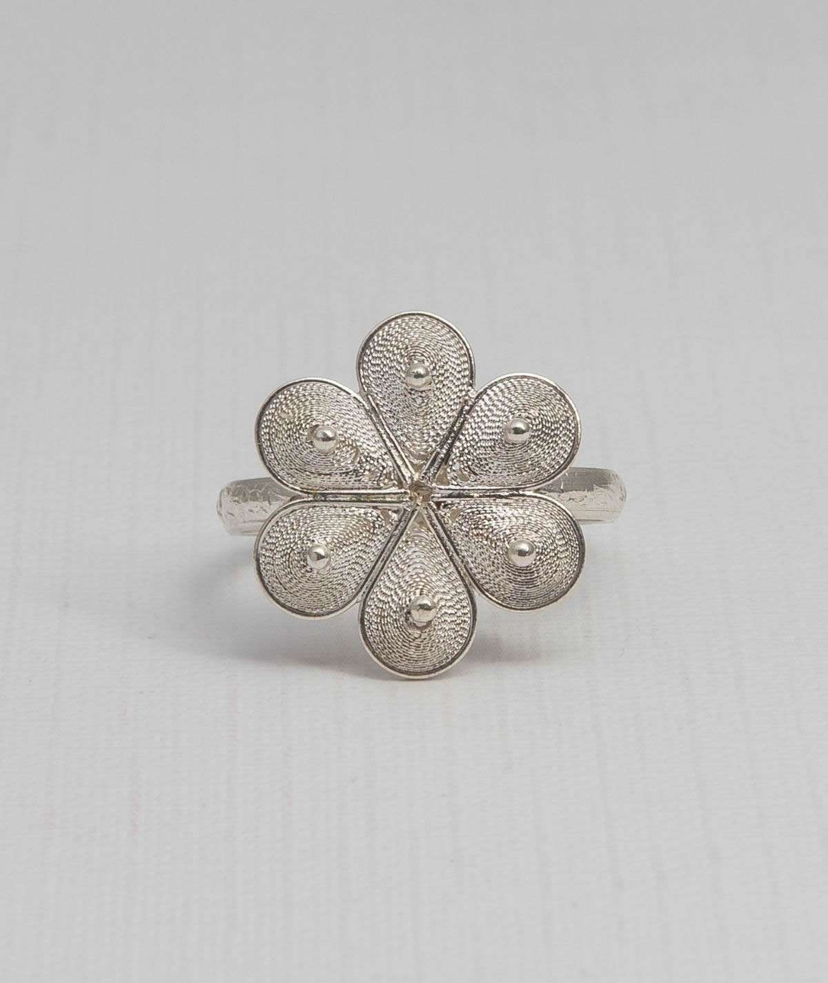 The silver setting perfectly complements the flower, adding a touch of refinement and allowing the filigree work to shine. The metal is sturdy yet elegant, striking a perfect balance between durability and delicacy. The ring sits comfortably on my finger, making it suitable for everyday wear.