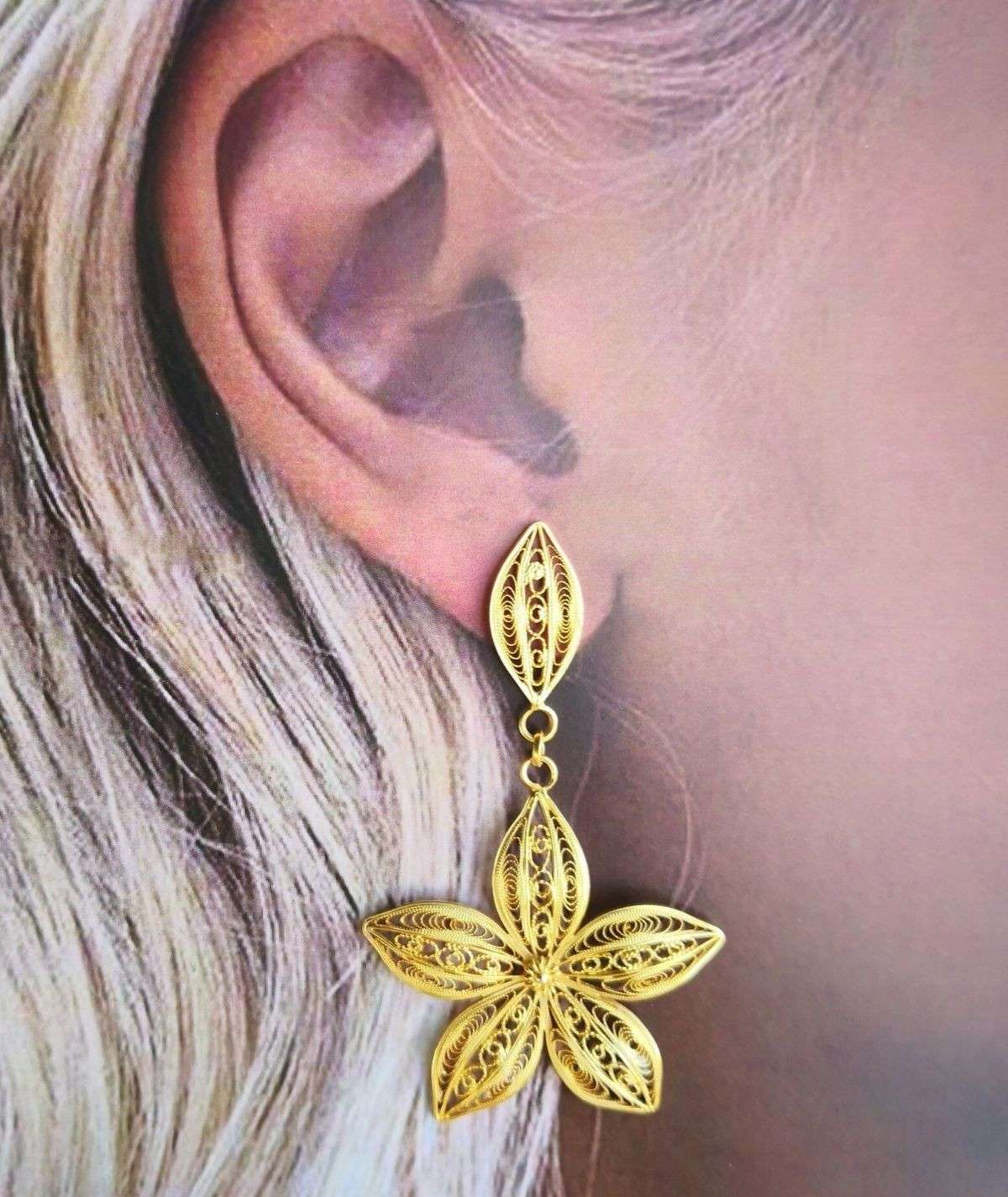 Therefore, Statement Flower Filigree Earrings is the epitome of elegance and artistry. Chandelier Flower Earrings in Gold-Plated Filigree are crafted entirely by hand. Therefore, these earrings are a true testament to skilled craftsmanship and attention to detail.